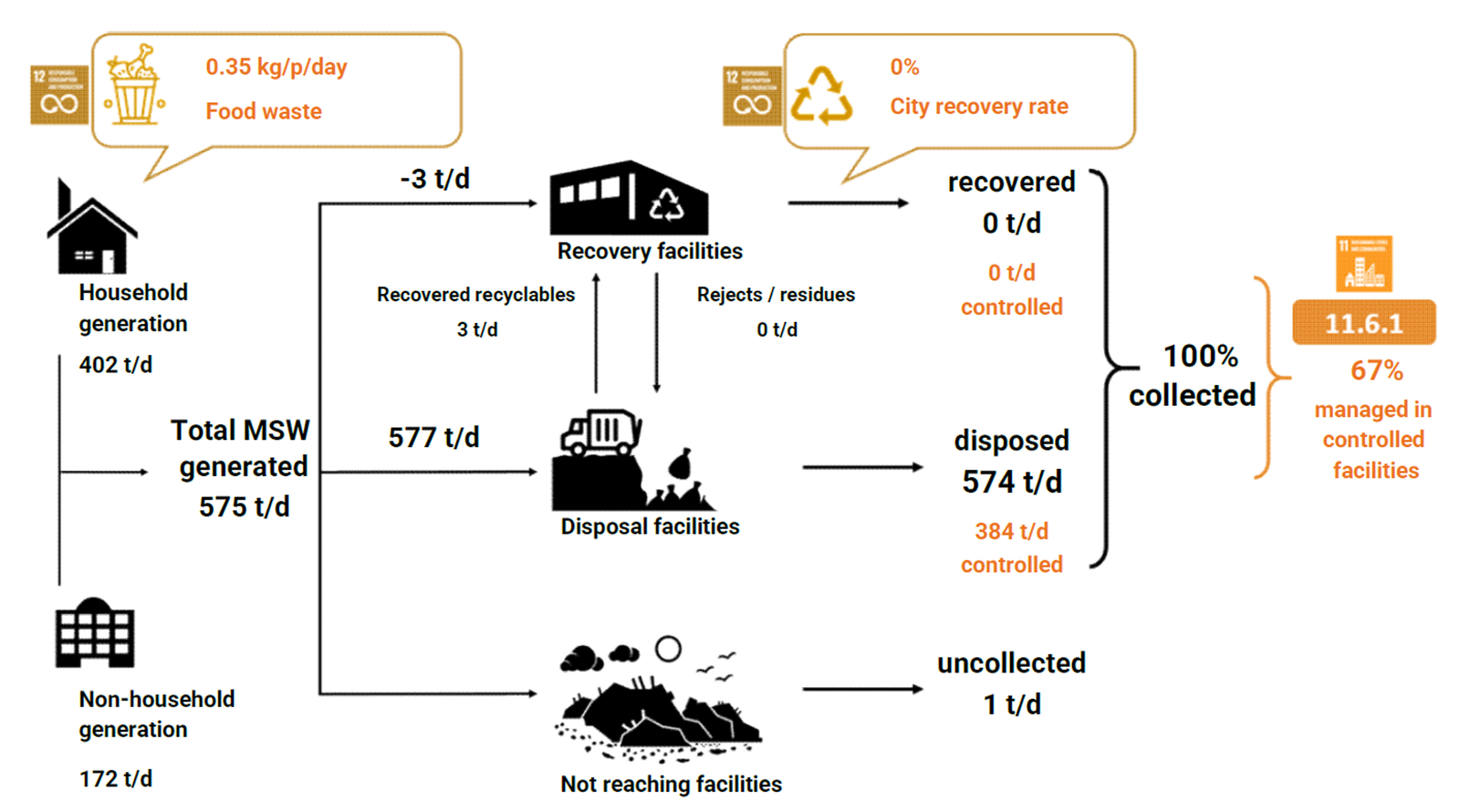 WaCT is a step-by-step method that helps cities measure how much of their municipal waste is safely collected and managed. It supports global Sustainable Development Goal (SDG) 11.6.1 and provides insights on food waste and resource recovery. Using WaCT, the team measured waste quantities, composition, and how waste moves through the system—from households to final disposal or recycling.